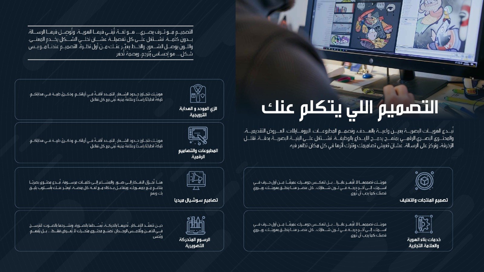 نبــدع الهويــات البصريــة بعيــن واعيــة بالهــدف، ونصمــم المطبوعــات، البروفــايلات، العــروض التقديميــة، ُ والمحتــوى البصــري الرقمــي بمنهــج يدمــج ابــداع بالوظيفــة. نشــتغل